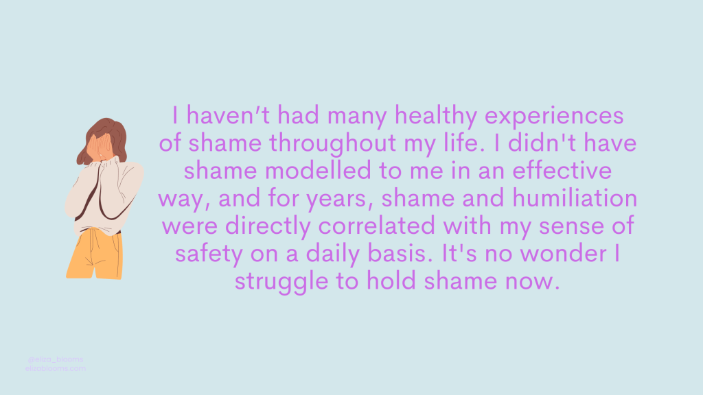 I haven’t experienced many healthy experiences of shame throughout my life, I haven’t had shame modelled to me in an effective way, and for years, shame and humiliation were directly correlated with my sense of safety on a daily basis.