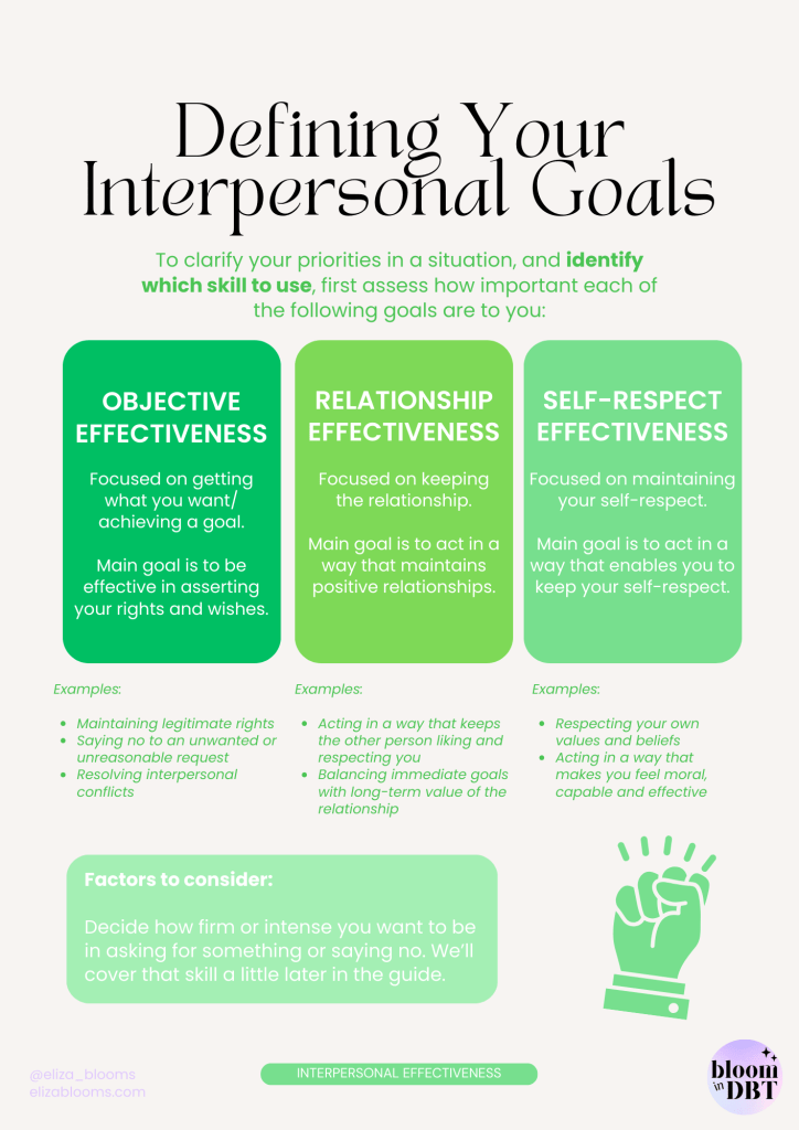 Within DBT, identifying your interpersonal goal in each situation, whether that’s Objective Effectiveness, Relationship Effectiveness, or Self-Respect Effectiveness, is paramount in nurturing healthy relationships.